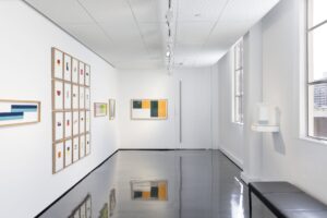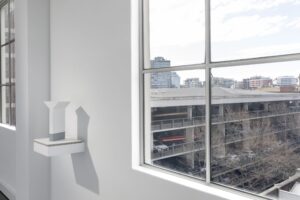 Featured in the exhibition is Atkins work, Carpark Column, Melbourne 2024, a miniature replica of the Y-shaped concrete pillars supporting Peter McIntyre’s architecturally significant 1960s Parkade Carpark, which can be seen – in fact, almost touched – from the windows of Gallery 2.