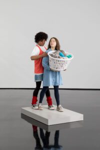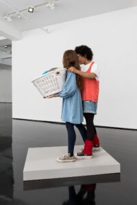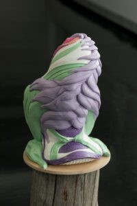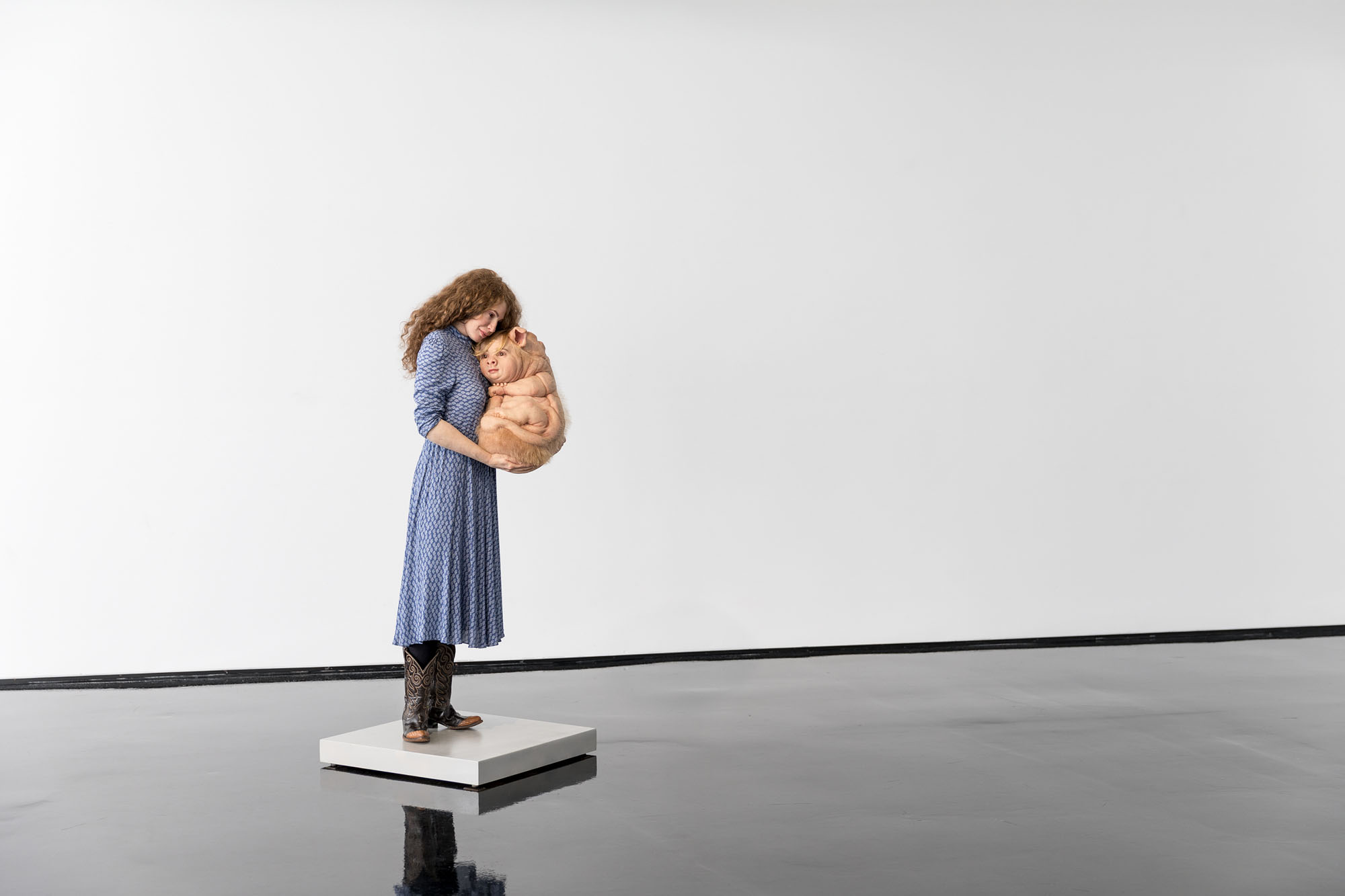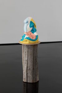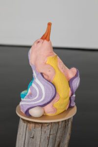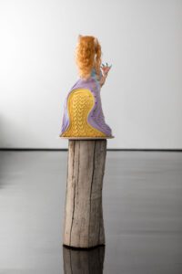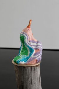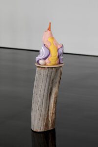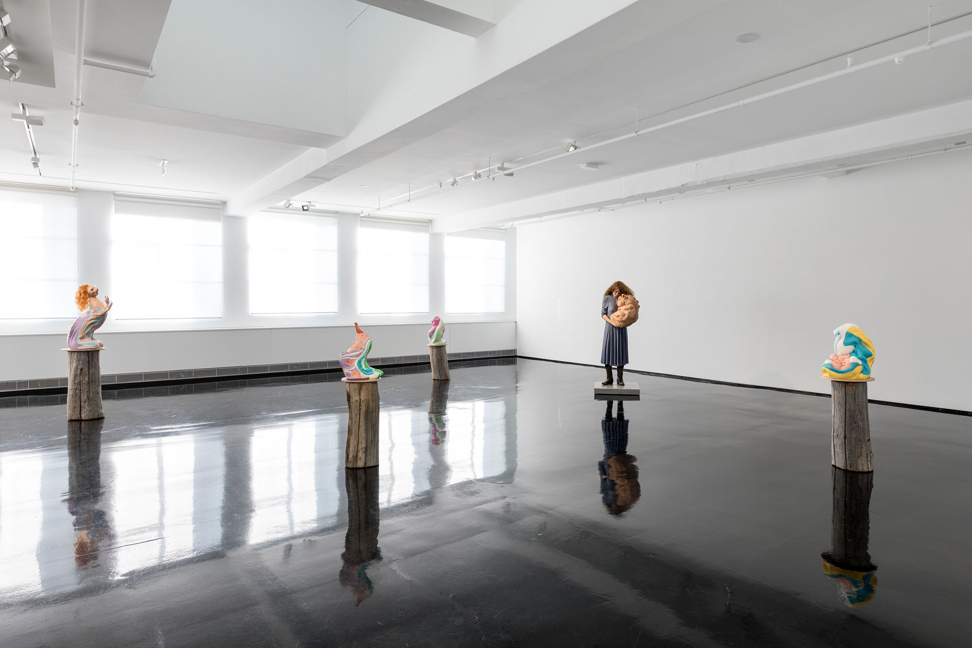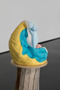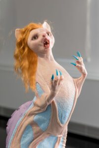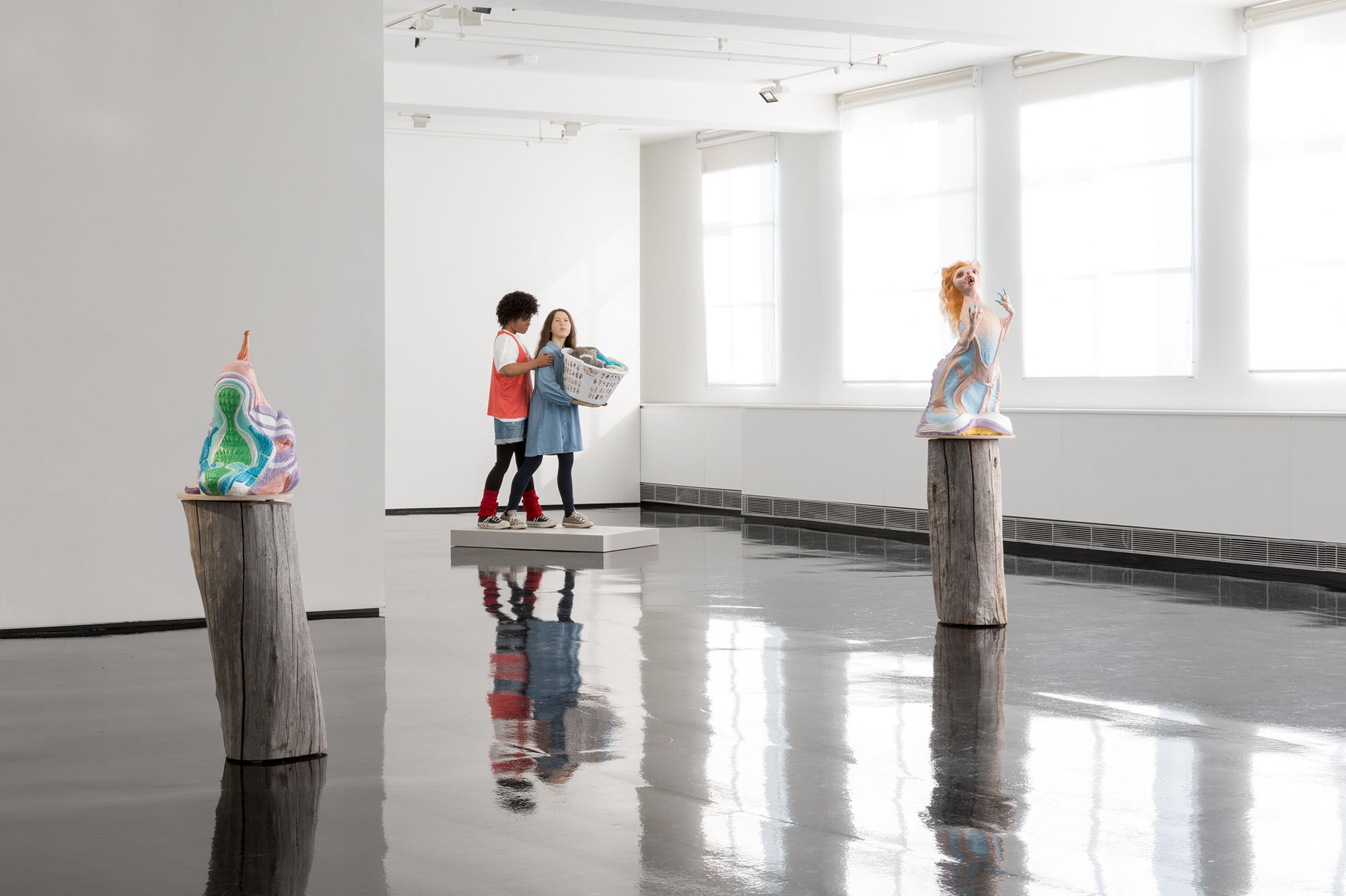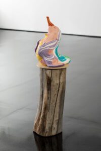 Encompassing human, animal and hybrid forms, the exhibition opens with an arresting series of figures in seductive colours that riff on the contemporary fetish for sneaker wear.